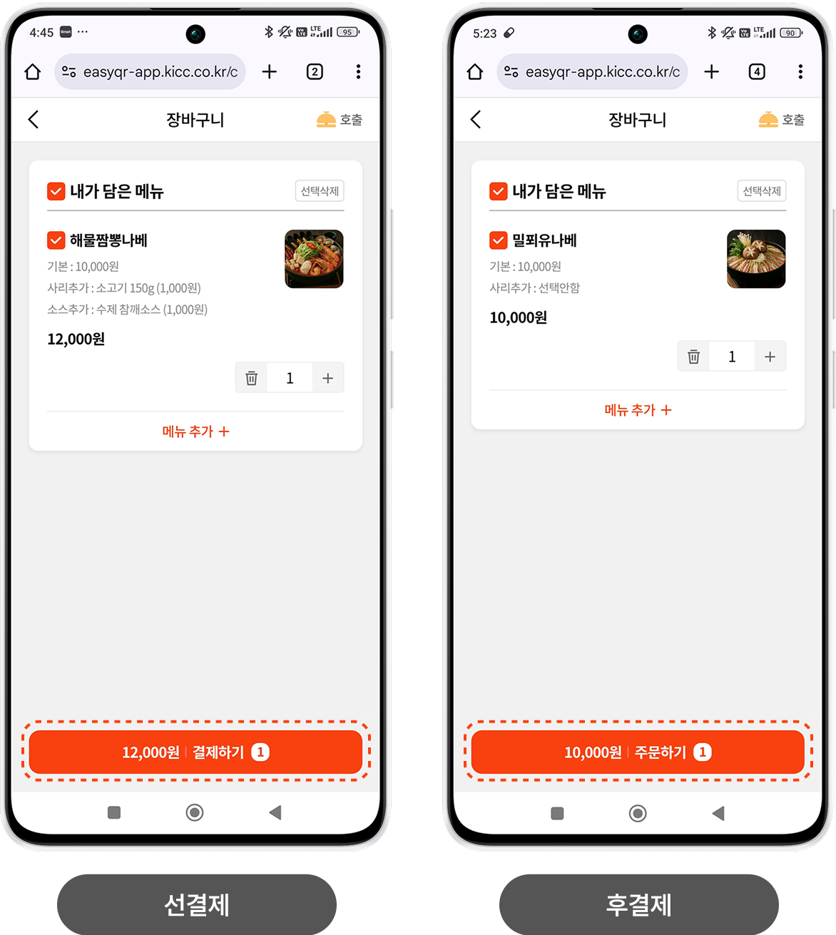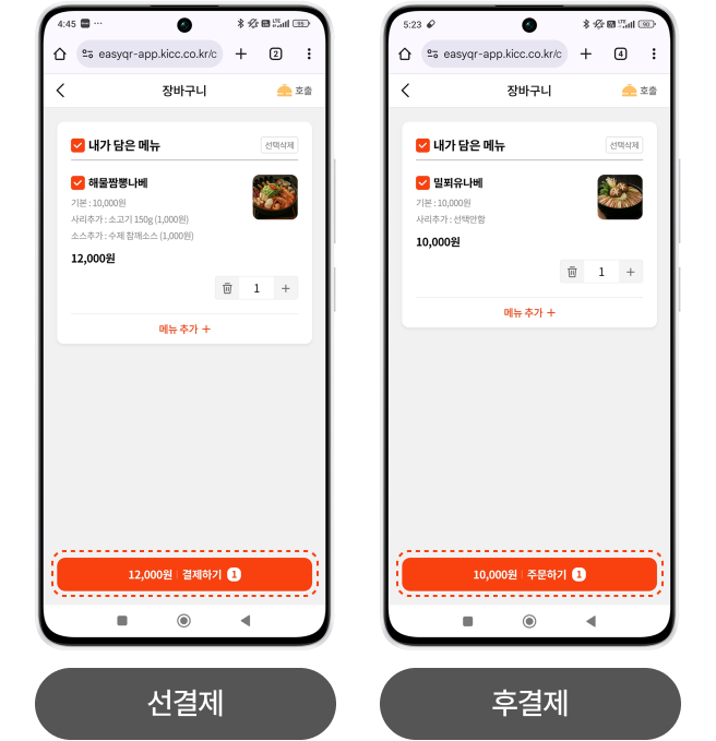 • 이지포스 운영 방식에 따라 이지QR 선결제 or 후결제 방식을 선택할 수 있습니다.