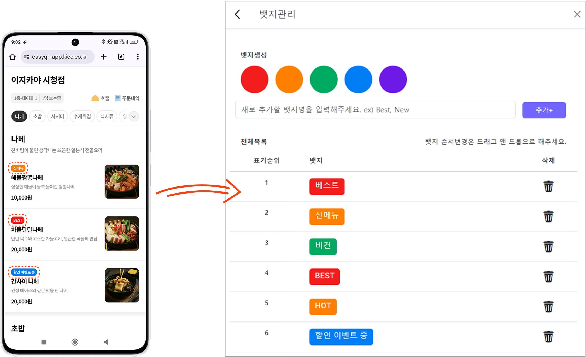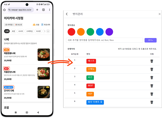 • 신메뉴/베스트/NEW/비건 등 원하는 문구를 직접 입력하는 등 자유롭게 뱃지를 등록, 설정하여 메뉴 강조가 가능합니다.